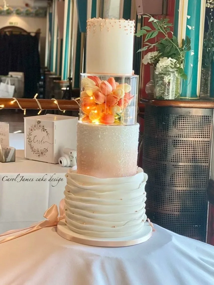 “Not only did she make a seriously tasty cake which was absolutely stunning, it was also sympathetic to my design which meant so much to me on my wedding day! Thank you Carol, I would highly recommend”